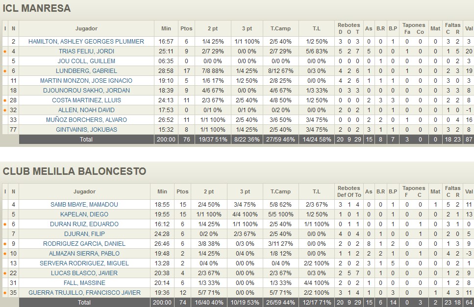 Se había sentido mucho más cómodo el ICL Manresa en los últimos minutos del primer acto y eso se tradujo en una mayor confianza a lo largo de una reanudación en la que un ttriple de Hamilton inquietó sobremanera a un Alejandro Alcoba que tiraba de tiempo muerto y pizarra. Pese a las indicaciones de su técnico, los melillenses siguieron sufriendo el buen momento de un ICL Manresa que aprovechó las pérdidas de balón para estirar su parcial hasta un 11-0 con el que colocarse por delante en el marcador (24-22). A base de rotaciones, los visitantes lograron desatascar su ataque pero el trabajo ofensivo del Melilla Bto no fue suficiente para poder frenar el juego interior de un ICL Manresa en el que Nacho Martín sumaba sus primeros puntos (6) y en el que Jordi Trias (7) comenzaba a hacer de las suyas para alcanzar el descanso con una pequeña renta (37-33).