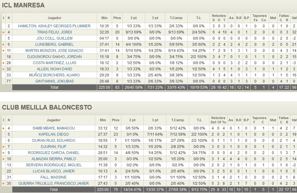 Con 10 minutos por jugarse y el triunfo aún en el aire, el ICL Manresa comenzó a golpear con fuerza a su rival desde posiciones interiores, un trabajo que el Melilla Baloncesto supo neutralizar desde su acierto exterior con Diego Kapelan “on fire”. Así se llegó al tramo final de un cuarto periodo en el que Mamadou Samb pudo haber sido decisivo con un triple al cuarto intento a falta de 14 segundos(68-70). Quedaba una última jugada y, en ella, Jordi Trias reforzó su condición de héroe con un tiro a falta de 3 segundos con el que apuntar directamente a la prórroga (70-70).