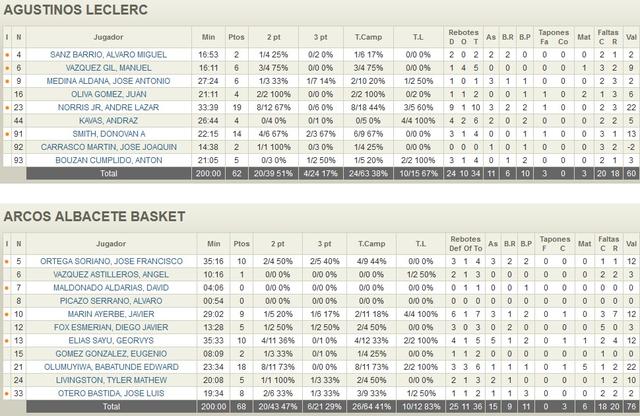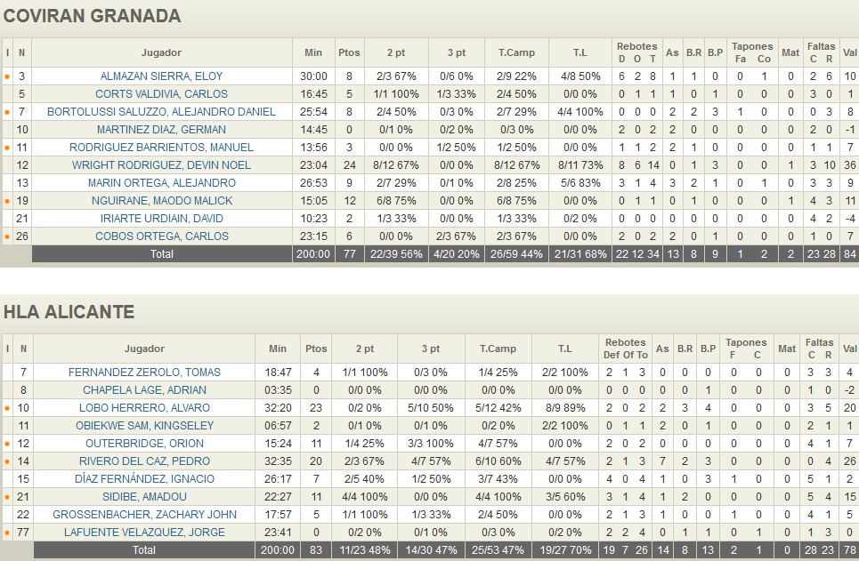 En las filas del HLA Alicante sobresalieron Alvaro Lobo con 23 puntos, 2 rebotes y 3 recuperaciones para 20 de valoración; y Pedro Rivero con 20 puntos, 3 rebotes, 7 asistencias, 2 recuperaciones para 26 de valoración.