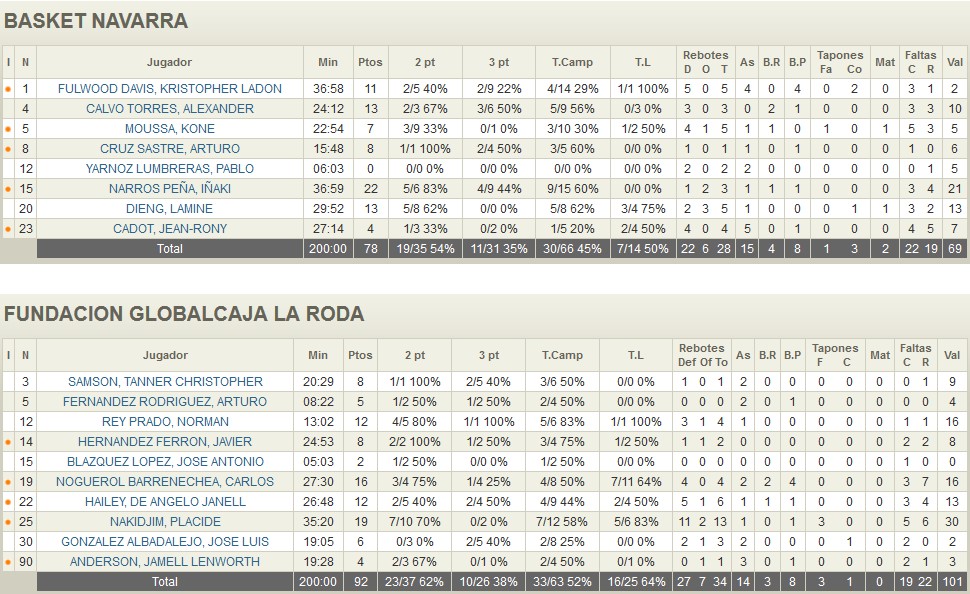 La precipitación en los tiros finales, triples en su mayoría, junto a la serenidad de Noguerol al timón (16 puntos) que supo manejar la presión que la grada ejercía en los dos minutos finales, supuso la segunda derrota de Basket Navarra como local e hizo aún más líder a La Roda, aprovechando la derrota de Granada.