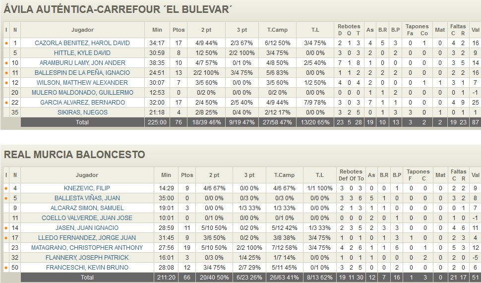 El partido del Carlos Sastre, tremendamente disputado y marcado por dos defensas muy trabajadas, se decidió en la prórroga. Antes del tiempo extra, hubo alternancia en el marcador con Harol Cazorla y Bernardo García asumiendo el mando de las operaciones ofensivas de los abulenses; mientras que Chris Matagrano se hacía grande en la pintura del Real Murcia. Los visitantes parecían llegar mejor a la recta final y un tiro libre del pívot americano ponía el 61-63 a falta de 12 segundos. La pizarra funcionó y una canasta de Cazorla llevó el partido a la prórroga, con los visitantes muy tocados anímicamente.