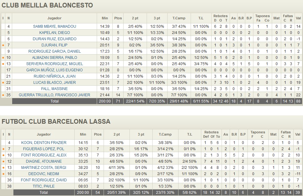 MAL DIA: No fue el día de los catalanes que tuvieron un partido horrendo aunque no faltó la intensidad que da la juventud. Con únicamente 8 jugadores, los culés tuvieron que lidiar con un pésimo partido en ataque ya que desde el triple firmaron un paupérrimo 3/25 (12%). Hasta 4 jugadores jugaron más de 30 minutos, mientras que en el Melilla Baloncesto nadie pasó de 24. Atoumane Diagne logró un doble – doble con 10 puntos y 11 rebotes, secundado por Sergi Martínez con 10 puntos y 8 rebotes. Al final del choque, el filial azulgrana terminó con 23/76 en tiros de campo.