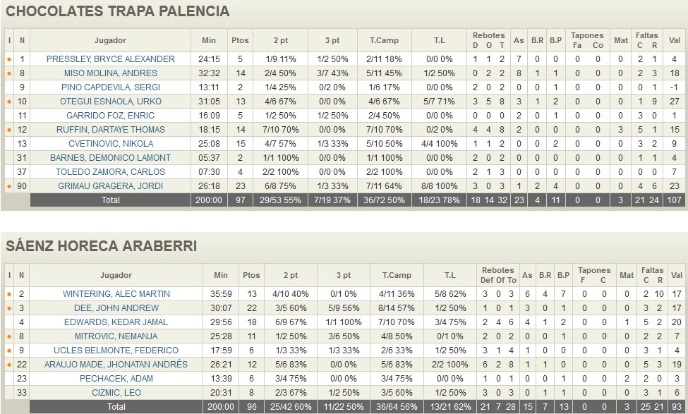 El Chocolates Trapa Palencia comenzó el partido con una intensidad digna de quien quiere controlar el partido desde el primer instante. Y durante los primeros minutos fue así. Un 2+1 de Urko Otegui y un triple de Miso daban la máxima ventaja al equipo palentino (22-11), que estaba dominando el encuentro. A partir de este momento comenzó la reacción de Sáenz Horeca Araberri, de la mano de Dee, que con dos triples consecutivos cambiaba el ritmo del partido y conseguían empatar al final del cuarto (24-24).