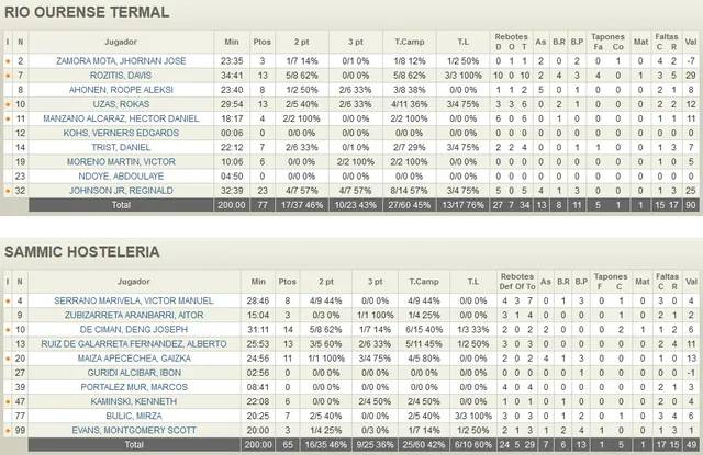 No consiguió anotar en los dos últimos minutos del tercer cuarto Sammic y tampoco lo haría en los cinco siguientes. Siete minutos sin conseguir una canasta fue una losa demasiado grande para los vascos, que vieron que ahí se les fue el partido. Ese tiempo, lo aprovechó el Rio Ourense Termal para sumar un parcial de 11-0, que se alargó hasta un 21-3 poco después. Rozitis intimidaba, las ayudas defensivas llegaban y los nervios atosigaron a Sammic, que no consiguió anotar hasta que Galarreta consiguió anotar un tiro libre. Para cuando terminaron de despertar, con una canasta con adicional de Bulic, el Rio Ourense Termal ya ganaba por quince (72-57, min. 38). Antes, llegó el momento de los triples de Uzas, Ahonen y Reggie Johnson, además de las conexiones de los tres generadores con Rozitis y Trist. Todos anotaban en el parcial de 21-3 y todos llevaban al Rio Ourense Termal a sentenciar la victoria. Aún con todo, al ganar por quince el objetivo había de ser doble: sumar el basketaverage. Y eso se complicó. Un parcial de 0-8 de Sammic llevó al Rio Ourense Termal a encauzar el último minuto con una ventaja de siete puntos en el marcador. Allí, un triple de Uzas, una canasta tras rebote de ataque de Trist y un fallo sobre la bocina en triple abierto de Galarreta ayudaron, pues el Rio Ourense Termal ganó por doce y se llevó el basketaverage por si fuera necesario en caso de empate al final de la liga.