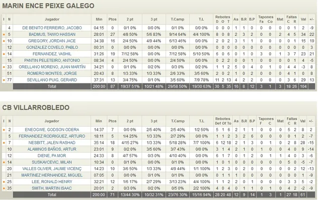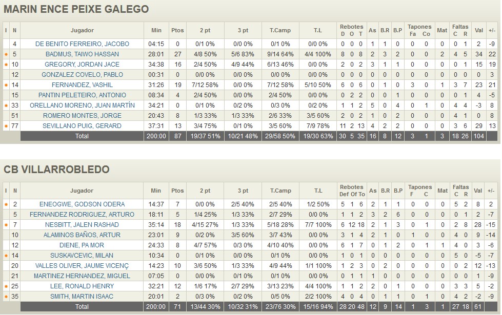 A falta de trece minutos el marcador reflejaba un 58-56 en el casillero, pero a partir de entonces los locales consiguieron anular la aportación ofensiva de Villarrobledo. Un parcial 12-1 resultó demoledor y los locales llegaron a rozar los 20 tantos de ventaja ante un Villarrobledo que veía como se alejaban sus opciones de ascenso. Ni siquiera el soberbio partido de Nesbitt (18p, 18r) fue suficiente ante la extraordinaria actuación de un Badmus (27p, 8r) que destrozó al rival desde el perímetro con un 5 de 6 en triples. Sevillano (13p, 13r) estuvo omnipresente y, junto a Fernández y Gregory dieron un soñado triunfo a Marín.