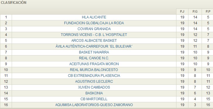 La zona media sigue apretada. Canoe y Ávila siguen al alza mientras que Navarra y Morón encadenan dos derrotas que les alejan casi definitivamente de los primeros puestos de la tabla.