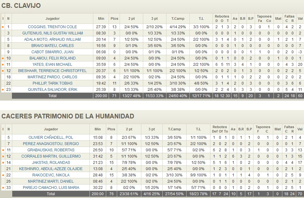 En un duelo clave en la lucha por la permanencia el Cáceres P. Humanidad se ha colocado a un sólo triunfo de la permanencia virtual tras su triunfo en la noche del viernes en Logroño. Un partido en el que los hombres de Ñete Bohigas asumieron el mando de partido durante los primeros compases pero en el que los riojanos se mantuvieron a rueda de su rival anticipando un igualado encuentro (18-22). El acierto extremeño a lo largo del segundo periodo permitió a a los visitantes asumir pequeñas rentas con las que alcanzar el túnel de vestuarios un paso por delante tanto en el electrónico como en el factor mental del choque (34-45). Logroño recuperar el CB Clavijo el terreno perdido a lo largo de una segunda parte en la que el base Treton Coggins comenzó a marcar diferencias para poder meterse de lleno en partido. Eso sí, sus esfuerzos no fueron del todo suficientes para poder dar caza a un Cáceres que no falló en el baile de tiros libre final para dar un paso al frente en su lucha por la permanencia (71-76).