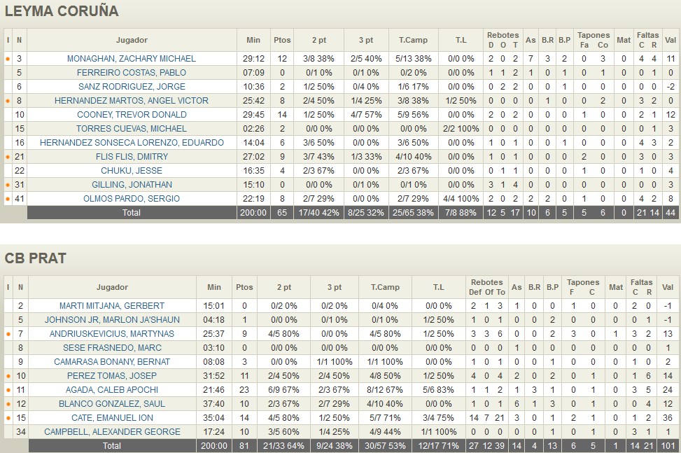 GOTERAS. En una jornada de lluvias moderadas y persistentes en la ciudad de A Coruña, el Leyma hizo aguas por todas partes. En el inicio de partido sufrió un doloroso parcial de 2-13 (minuto 4:26) que marcó el desarrollo del mismo. El equipo visitante anotaba con facilidad a través de situaciones de 2×2, jugadas individuales o tras rebote ofensivo y, atrás, tejía una telaraña impenetrable con un enorme Andriuskevicius en el centro de la pintura y una enorme actividad de manos y piernas de todos los jugadores. De este modo, la zona catalana era terreno prohibido para los jugadores locales que se tenían que jugar lanzamientos fuera de posición o se tropezaban con una muralla infranqueable. Saúl Blanco demostraba que todavía tiene litros de baloncesto en sus venas y Emanuel Cate empezaba a realizar un impagable trabajo de hormiga obrera. Sólo dos triples de Cooney daban esperanzas a los coruñeses. Después de 10 minutos de juego el Prat dominaba 12-23.