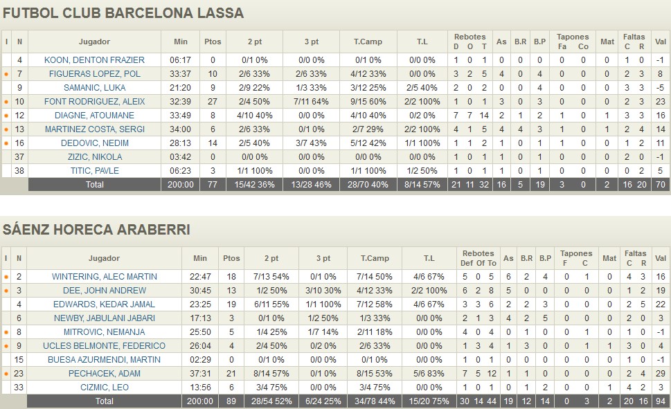 DOMINIO DE ARABERRI: Los vascos han salido fuertes con un 0-10 de salida que les ha situado con una ventaja que ya no han abandonado. A pesar de los esfuerzos de los jugadores del Barça B para reducir la ventaja (con Font como estilete) solamente han podido llegar a empatar el partido en algún tramo del tercer cuarto (43-43). El conjunto vitoriano apoyado básicamente en 4 jugadores (Pechacek, Edwards, Wintering y Dee) ha llegado a tener ventajas superiores a los 15 puntos (65-82) y ha sabido aprovecharse de la baja del mejor jugador local Volodymyr Herun (con partido de ventana FIBA este lunes ante Suecia).