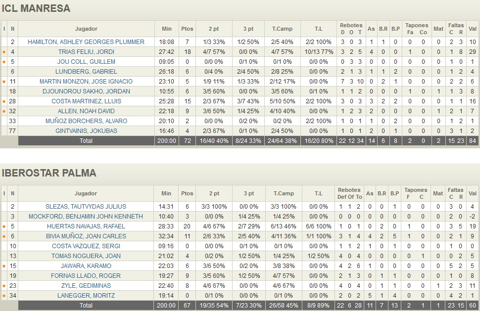 MANRESA CONTROLA, PALMA TUVO SU MOMENTO A pesar de la mejora de la defensa de Palma, el problema le viene en ataque. Cuando todo parecía decidido tras dos tiros libres de Hamilton (66-55) la garra de Huertas en las penetraciones consigue sacar 6 puntos (4TL y una canasta) para el 66-61. En ese momento le entran los nervios a Manresa y parece el momento de los mallorquines. Pero, como ya pasó en el partido anterior, 6 errores consecutivos en ataque hace que, al final, la canasta para prácticamente para cerrar el partido sea de Trias en forma de TL. Las acometidas posteriores de Iberostar dejan el resultado en un 72-67, nadar para morir en la orilla. De haber acertado en momentos clave el partido podía haber sido para el equipo visitante, aunque la victoria de los catalanes se me antoja más que justa.