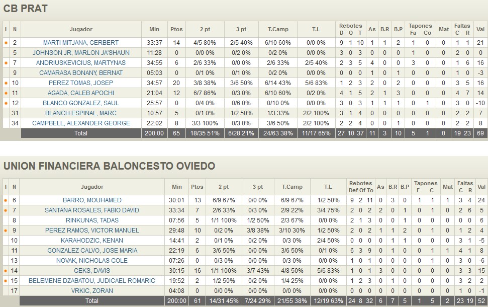 Se enfrentaban dos de los equipos de la zona alta de la tabla en un sábado con ese único partido en la parrilla de la LEB Oro. Dos ausencias destacadas en ambos bandos: Oliver Arteaga para los asturianos, y Emanuel Cate en los catalanes. Y el choque no defraudó, con igualdad en el marcador final, aunque con un baloncesto muy irregular en los dos equipos. El inicio fue igualado, con los dos púgiles mostrando respeto a su rival, pero el segundo cuarto fue de los locales, con un gran Gerbert Martí que anotaba con facilidad, y con Josep Pérez marcando el ritmo de las operaciones. A falta de un minuto para el descanso el 38-23 se convertía en la máxima diferencia y dejaba al Unión Financiera Oviedo muy tocado. Tras el paso por los vestuarios, y la correspondiente charla de Carles Marco, los asturianos cambiaron por completo. Del 38-23 se pasó al 40-40 tras canasta de Barro. Una defensa muy intensa y forzando el dos contra uno provocaba fallos en el ataque local y el parcial fue totalmente inverso. El 21-8 del segundo cuarto se convirtió en un 11-23 y 10 minutos por jugar. Los de Arturo Álvarez cogieron una pequeña ventaja a principios del último cuarto y la supieron mantener hasta el duelo final de los Pérez. Víctor, el del Unión Financiera, intentaba remontar desde el triple con dos consecutivos en los segundos finales. Josep, el del CB Prat, lo contrarrestaba desde la línea de personal, certificando la victoria.