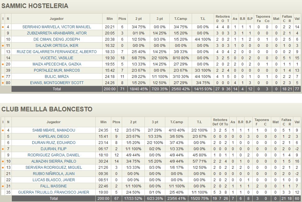 El Sammic ISB se había sentido superior en algunos minutos del tercer acto y esa inercia debió ser aprovechada por su técnico en la arenga del descanso ya que, con ello, los guipuzcoanos regresaron a pista mucho más enchufados hasta reducir a tres puntos la renta de un Melilla Baloncesto para el que el partido comenzaba a complicarse (47-50). Con el debutante Vasilije Vucetic en modo MVP y Alberto Ruiz de Galarreta secundando su trabajo desde el 675 los locales fueron capaces de invertir el marcador a lo largo de un último periodo en el que lanzaron su órdago por el triunfo. Así, la victoria se quedaba en casa y los locales daban un paso al frente hacia la permanencia (71-67).