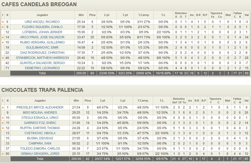 No había perdido el Cafés Candelas Breogán ni un solo encuentro sobre su pista durante la presente temporada y fue por ello que los nervios se incrementaron en los momentos importantes de un encuentro en el que el Chocolates Trapa Palencia había mostrado su candidatura al triunfo durante los 40 minutos. Un duelo en el que los palentinos osaron a llevar la voz cantante donde nadie lo había hecho ya desde un salto inicial que precedió a sus primeras acciones en positivo. Con mucha confianza en su tiro, los de Alejandro Martínez fueron capaces de marcharse por delante al primer entreacto (20-23) pero su primera renta importante llegó con un triple abierto de Carlos Toledo con el que inquietar a su rival (22-30). De hasta diez puntos a su favor llegaron a gozar los colegiales pero el líder de la competición es mucho líder y un 2+1 de Matt Stainbrook seguido de un triple de Salva Arco equilibraron de nuevo un partido que marchaba igualado al descanso (38-39).