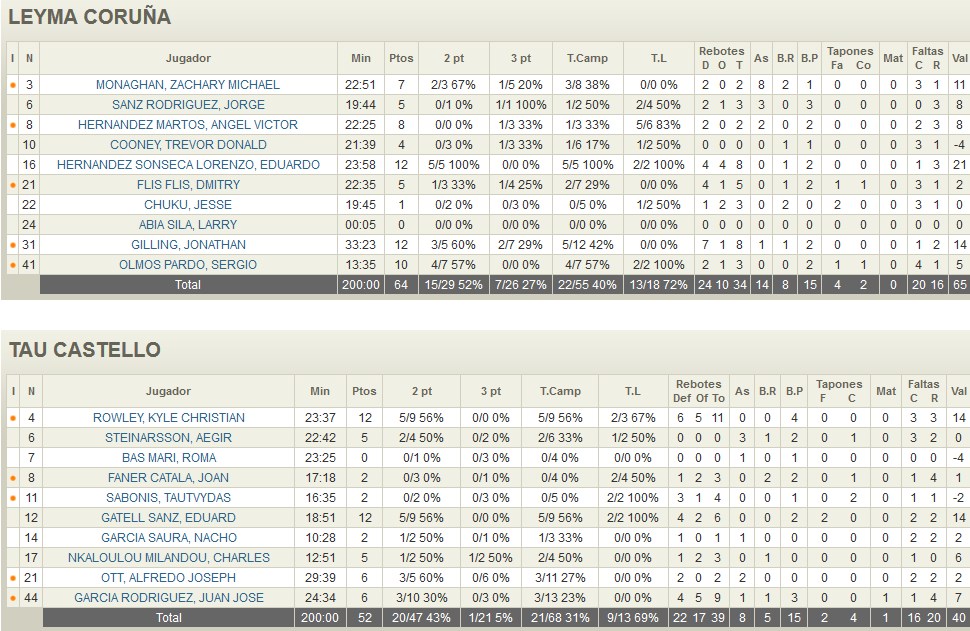 LADRILLO A LADRILLO. Ladrillo a ladrillo, defensa a defensa (mención especial a Chuku que, pese a jugar mermado por un esguince de rodilla, se convirtió en un valladar), triple a triple, el Leyma edificó el edificio de su victoria. Y es que los naranjas anotaron 4 de sus 7 triples en la primera mitad del último acto. Por su parte, el TAU arrojaba ladrillos (no balones) sobre la canasta coruñesa, como demuestra su porcentaje en triples al final del partido (1/21). Huérfanos del acierto perimetral, los visitantes se encomendaron a su juego interior (sus exteriores aportaron únicamente 17 puntos a lo largo del choque) pero el Leyma supo solucionar la vía de agua del rebote defensivo y consiguió además pagar al TAU con su propia moneda (sólo 3 rebotes ofensivos para los levantinos en la segunda mitad por 6 del Leyma). Los ataques locales en los últimos cuatro minutos del encuentro se limitaron a especular y dejar correr el crono pero el TAU se mostró inoperante para luchar por el basket average. Su edificio había sido demolido y ya no había forma de volver a levantarlo.