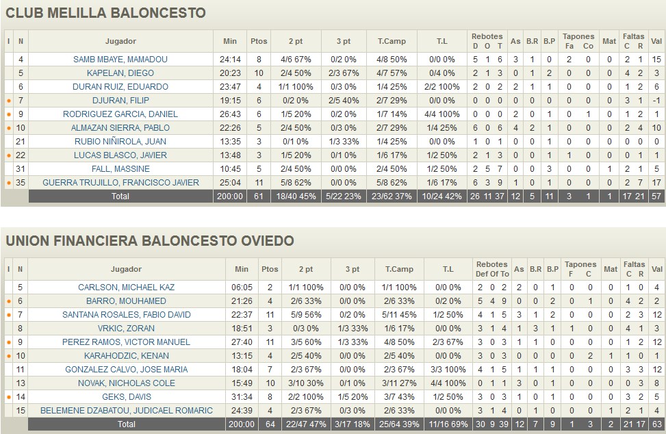 Dos equipos igualados en la tabla, jugando un partido a pocos puntos, y decidido en la jugada final. El Melilla Baloncesto ahonda su mini-crisis (3 derrotas consecutivas) y apunta esos momentos de irregularidad que le llevan a perder de 9 puntos a falta de 3 minutos (51-60) o de tener bola para llevar el partido a la prórroga. Un Carlos Marco que nunca había ganado en la Ciudad Autónoma planteó una guerra táctica limitando el tiro exterior de los de Alcoba y asegurando el rebote defensivo. Buen partido de Fabio Santana desde la dirección, con un Víctor Pérez apareciendo en los momentos importantes y Chema González entrando cada vez más en dinámica. Diego Kapelan fue el protagonista de ese último intento de remontada, pero en la jugada final fue Pablo Almazán el que intentó el triple desde la frontal que fue demasiado largo y rebotó en el aro.