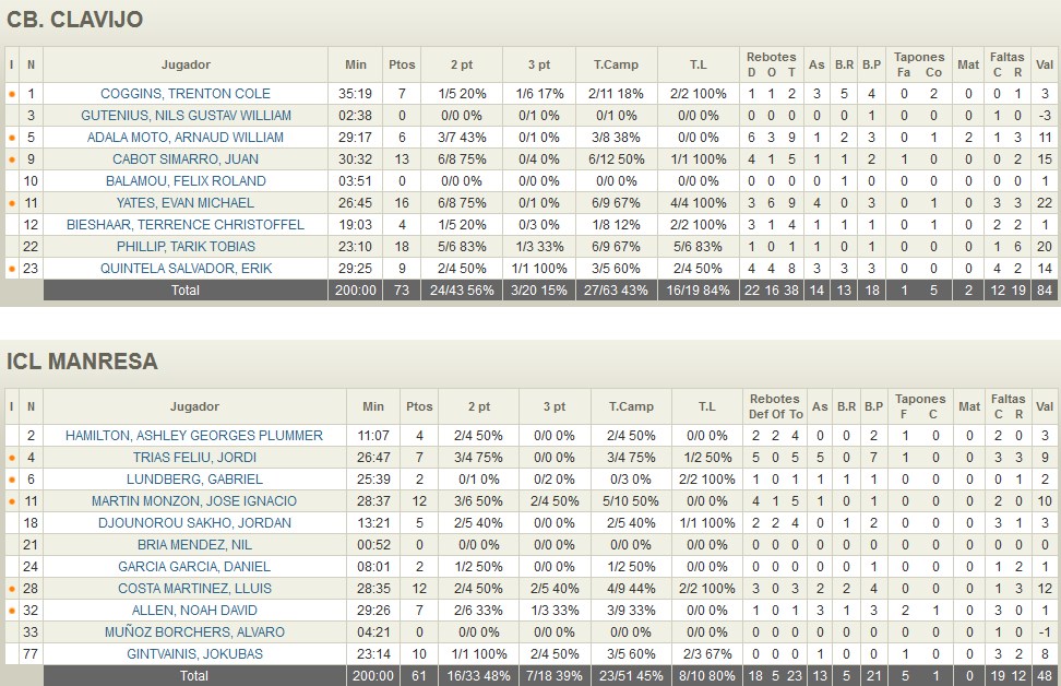 Y mientras en Lugo su rival se daba un festín de puntos, el ICL Manresa sufría en un partido de pocos puntos y en un segundo tiempo en el que sólo pudo anotar 24 puntos en 20 minutos. Eric Quintela salió muy enchufado para iniciar unos buenos minutos de los de Jenaro Díaz, con la intención de que el partido no fuera fácil para los catalanes. Una guerra táctica que impedía jugar con facilidad al dúo Trías-Martín, mientras que Yates y Phillip hacían daño en el juego de cinco contra cinco. De todos modos, el partido estaba donde lo quería Aleix Durán (53-53 minuto 29). Pero cuando parecía que iba a salir a relucir la veteranía de los pesos pesados del ICL Manresa, apareció el carácter de jugadores como Juan Cabot o Tarik Phillip para dejar la victoria en un Palacio de los Deportes que disfrutó con un equipo que cree en la salvación.