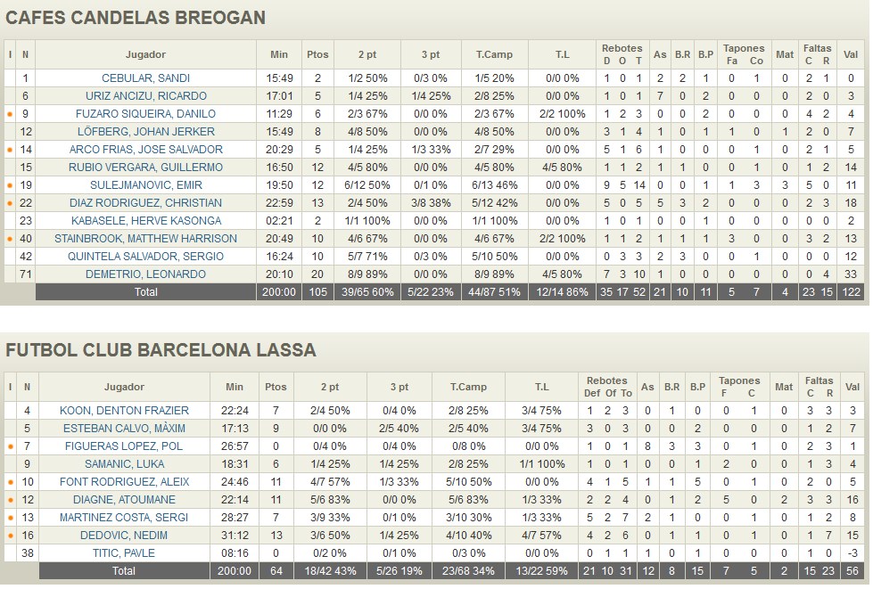 La LEB Oro puede cambiar en una semana gracias a la igualdad y las frecuentes sorpresas. Después de dos derrotas de los gallegos, la última en el Nou Congost, parecía volver más rojo y menos celeste la clasificación pero siete días después el Cafés Candelas Breogán es más líder y sentencia su compromiso con un recital ofensivo y una ventaja importante. Y eso que el partido comenzó con un 2-9 y el primer tiempo muerto de Natxo Lezkano a los tres minutos. En la siguiente jugada, un triple de Salva Arco desde la esquina señalaba el camino. Y por la senda del juego rápido y la defensa intensa viajó el Candelas Breogán ante un FC Barcelona Lassa que iba bajando los brazos según pasaban los minutos. 105 puntos anotados (a pesar del bajo porcentaje de triples), pero con seis jugadores por encima de la decena de puntos) y un banquillo más extenso que su rival, certificó una victoria muy celebrada por la afición. Leonardo Demetrio (20+10) en 20 minutos de juego, fue su mejor hombre.