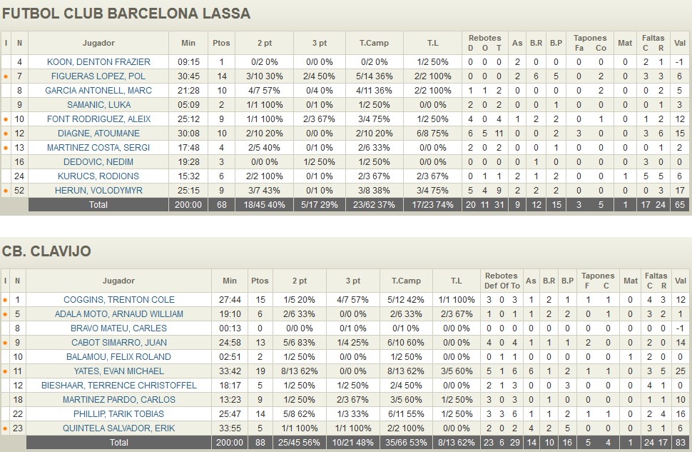 BACKCOURT DE CLAVIJO: Tarik Phillip y Tre’ Coggins han sido los dos pilares ofensivos desde el perímetro del equipo de Jenaro Díaz. El primero ha hecho daño a la defensa blaugrana con sus penetraciones y su tiro a media distancia y el segundo con su inspiración en el lanzamiento de 3 puntos (4/6 esta noche). Entre los dos han sumado 29 puntos siendo un complemento perfecto para Yates. La capacidad física de ambos y su calidad ofensiva han sido fundamentales para la victoria de su equipo.