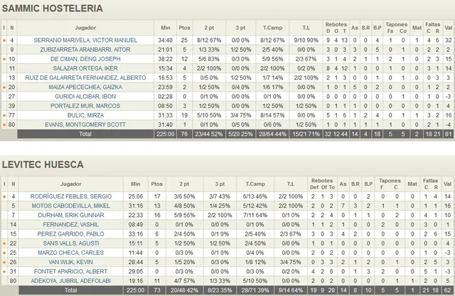 La victoria del Iberostar Palma el sábado revolucionaba los puestos de descenso, dejando el partido de Azkoitia como una auténtica final. Y la victoria de los locales, en la prórroga, deja con 11 victorias a cinco equipos, una más que el colista FC Barcelona Lassa. La importancia del partido provocaba nervios en un primer tiempo con bajos porcentajes, poco triples y muchas pérdidas. Iker Salazar se hacía dueño de los rebotes (hasta 9 en el descanso), mientras que Sergio Rodríguez y Erik Durham estaban acertados en el ataque. Al descanso se llegó con victoria parcial de los aragoneses (25-28) pero el buen inicio del tercer cuarto permitió al Levitec Huesca alcanzar los 10 de ventaja (32-42). Fue el momento de Víctor Serrano, que se echó el equipo a la espalda para dejarlo en 2 puntos al inicio del último cuarto (47-49). Una canasta de Van Wijk ponía el 60-64 a falta de un minuto pero dos libres de Serrano, un triple errado de Motos y una canasta de Bulic llevaba el partido a la prórroga. Viniendo desde atrás, el Sammic ISB empezó mejor el tiempo extra y tenía el partido ganado (75-70) a falta de un minuto. El Levitec Huesca fue capaz de anotar un triple y recuperar el balón, pero ni el tiro de Rodríguez ni el triple de Adekoya entraron y la victoria se quedó en casa.