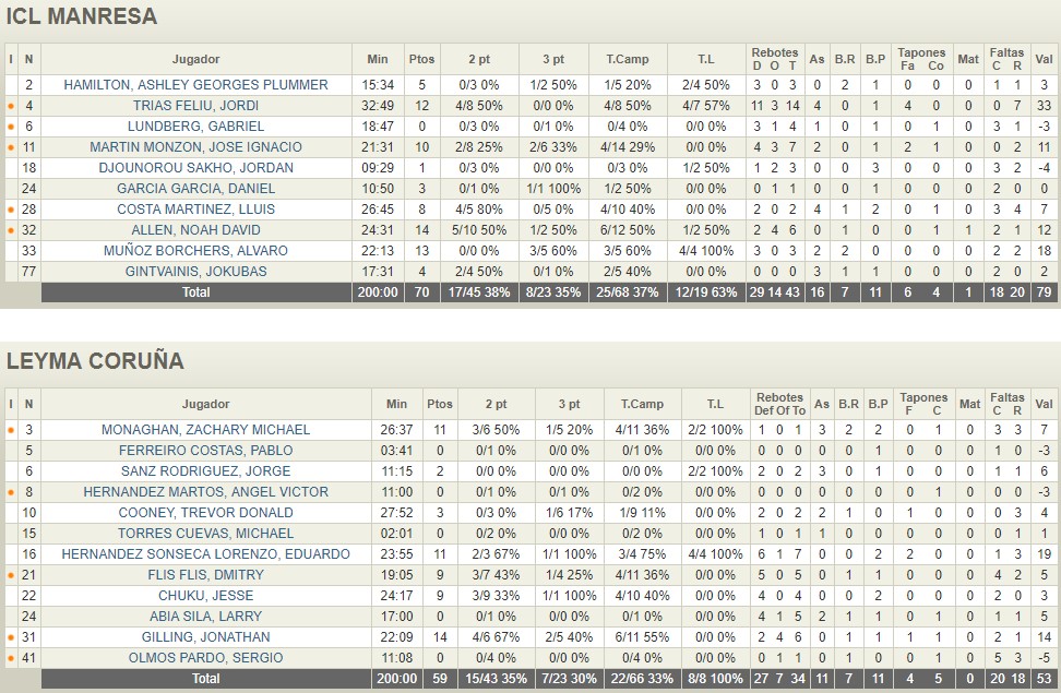 Jordi Trías llevó al ICL Manresa a su primer triunfo en un partido que tuvo en todo momento controlado pero que nunca llegó a romper. Sin embargo, el ‘factor Trías’ fue suficiente para que el ICL Manresa no pasara apuros en su primer partido con su entrenador nuevo. Con sólo 12 puntos anotados, Trías se fue hasta los 33 de valoración apoyados en 14 rebotes, 4 asistencias y 4 tapones. Junto a él, Álvaro Muñoz y Noah Allen comandaron el triunfo catalán ante un Leyma Coruña que tuvo en Eduardo Hernández-Sonseca a su hombre más valorado.