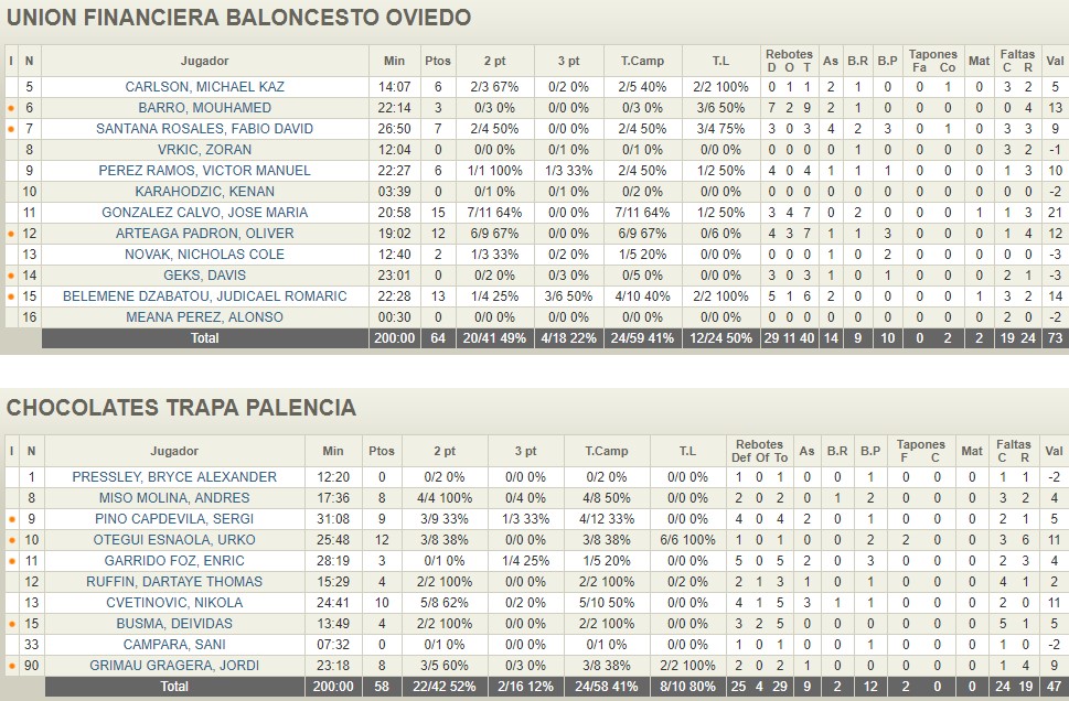 | UNION FINANCIERA BALONCESTO OVIEDO – CHOCOLATES TRAPA PALENCIA | 64-58 |