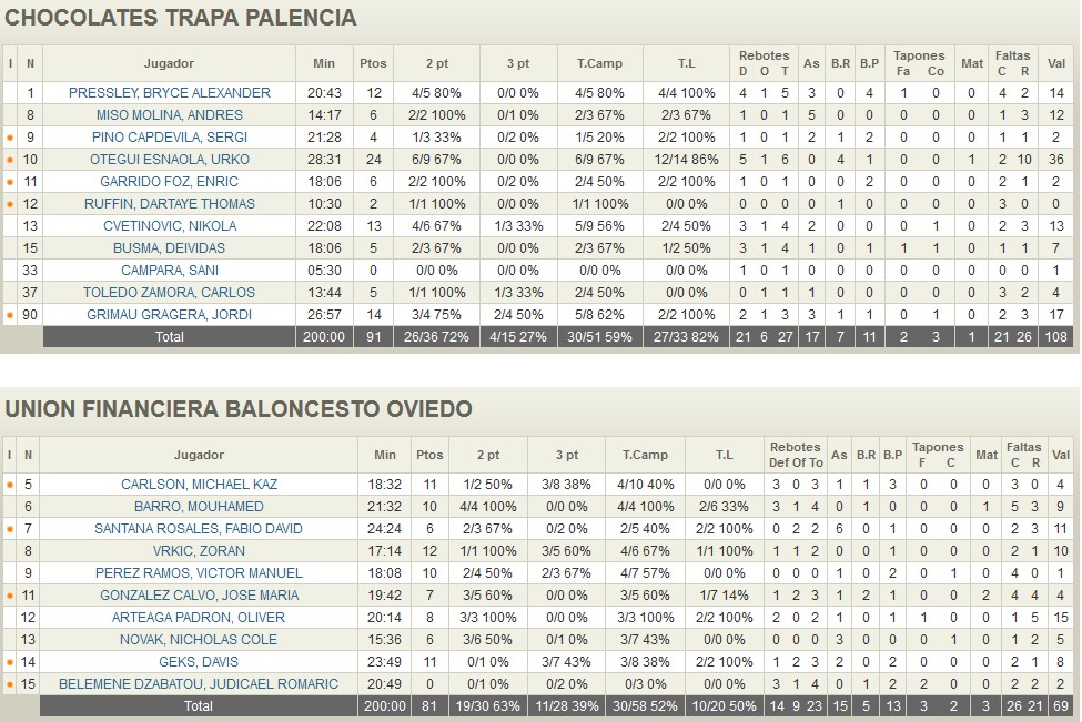 | CHOCOLATES TRAPA PALENCIA – UF BALONCESTO OVIEDO | 91-81 |