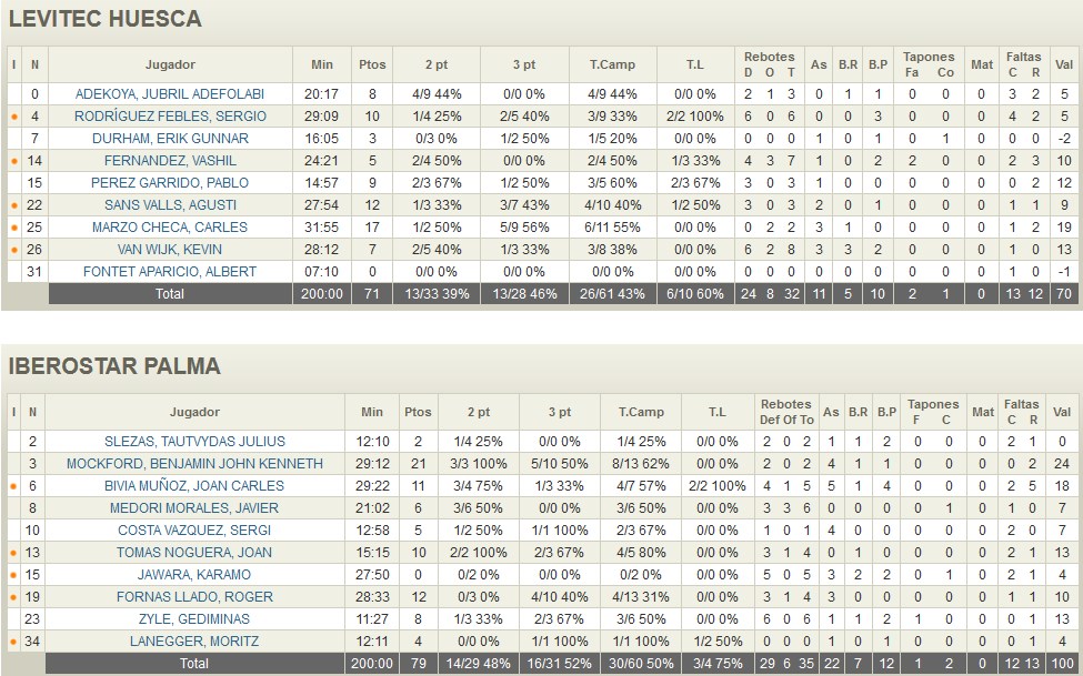 CONTROL BIVIA, cuando el veterano base ha tomado el control del partido, este ha cambiado el rumbo, sus asistencias, sus punto se incluso sus rebotes dieron alas a los suyos, pese al buen partido de Carlos Marzo, Bivia le tomo el ritmo al encuentro y entre los veteranía propia del base y la de Fornas, más los buenos puntos de Mockford, daban la victoria a Palma que suma una victoria y los coloca a una victoria de salir del descenso. 71-79, cuarta derrota de Levitec Huesca, que olvida el play off y le va a tocar sufrir para asegurar la permanencia. Las lesiones de Fontet que no acaba de coger el ritmo, de Motos sin poder participar en el partido y los nefastos fichajes de última hora que ha realizado el Peñas, dejan al equipo tocado para estas últimas jornadas.