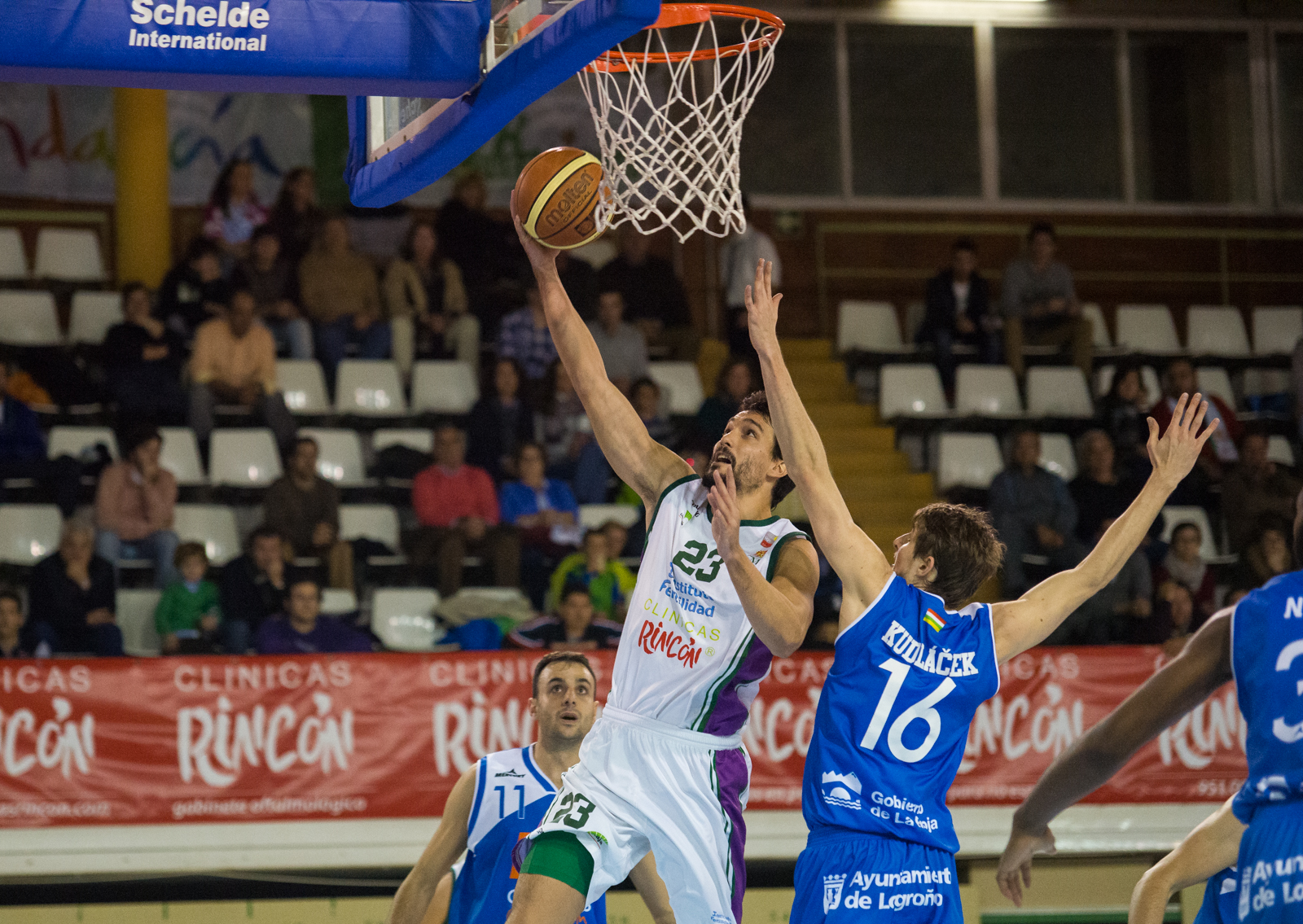BUEN INICIO LOCAL Se repetía la historia del último partido en casa frente a Planasa y el Clínicas Rincón salía lanzado, poniendo tierra de por medio. Richi Guillén se movía en los primeros instantes con comodidad en la pintura, pero sería esta vez Alfonso Sánchez su punta de lanza, capaz de anotar 9 puntos sin fallo en la recta final. Un mate espectacular de Karahodzic y un triple de Sánchez ponían precisamente la máxima ventaja de 13 puntos para los locales. Las bajas de Tutty Sabonis y Guti eran bien suplidas por un debutante, Manu Vázquez, que daba un paso adelante en su formación, saliendo incluso como titular y demostrando buenas maneras. La superioridad local era evidente en cancha y para nada hacía presagiar que se pasarían apuros en el encuentro. Pero las rotaciones en el segundo cuarto mermaron el juego del Clínicas. La ausencia de Guillén en pista propició situaciones cómodas de tiro a su rival al que regalaba en varias ocasiones segundas opciones que solía aprovechar sobre todo un atento Zimmy Nwogbo. Y de no ser por los también errores del conjunto visitante, la diferencia a favor del cuadro riojano hubiese sido mayor y no el marcador al descanso de 37-39.