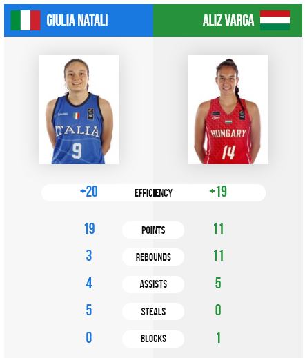Ilaria Panzera (Italia) (11,6 puntos, 6,3 rebotes y 4,4 asistencias): Un año menor que la mayoría de rivales, Panzera ha sido la gran estrella y artífice de la victoria de la selección Italiana, la escolta se ha mostrado como una jugadora completísima que ha rozado en ocasiones el triple-doble, siendo especialmente importante en los partidos de cuartos frente a España o las semifinales frente a Rusia. Sus grandes actuaciones le otorgaron el título de MVP del torneo.