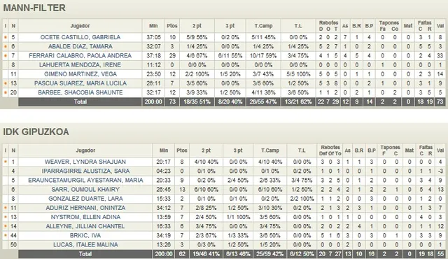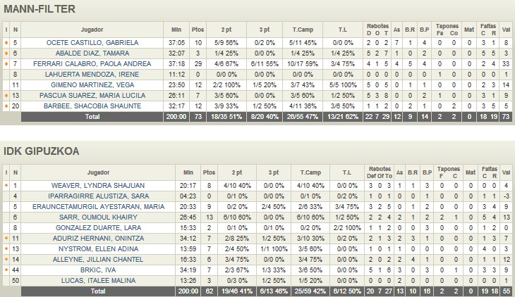 - Exhibición de Paola Ferrari. La escolta paraguaya fue la gran protagonista del partido con 29 puntos, 5 rebotes, 4 asistencias, 5 robos y 33 de valoración. Es la líder por excelencia dentro de la pista, no tuvo piedad de su ex equipo y Mann-Filter se aferró a su acierto desde el perímetro (6/11 en triples) para pasar de ronda. Los 21 tantos anotados en la primera mitad, vitales para marcar el camino hacia la victoria.