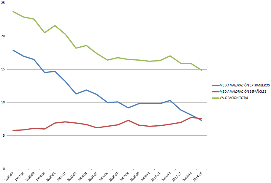 Se puede ver que, históricamente, los jugadores extranjeros han dominado los rankings. Hay que tener en cuenta que desde 2003 en el apartado de extranjeros entran también jugadores comunitarios, con lo que aumenta el número de jugadores no nacidos en España en la liga, pero aún así la presencia de extranjeros en los tops va disminuyendo. En los últimos años se ha invertido radicalmente la gráfica, pasando a ser los jugadores nacionales los mejor valorados de la competición.