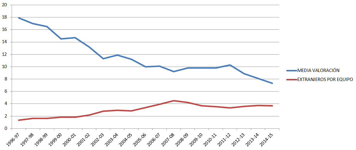 En la siguiente gráfica comparamos la evolución de la valoración media de los jugadores extranjeros en la Adecco/LEB Oro con el número de extranjeros que hay por equipo. Se observa claramente que el número de jugadores extranjeros aumenta, sobre todo desde que entra en vigor la Ley Bosman. Sin embargo, la valoración media del jugador extranjero sufre un progresivo descenso.