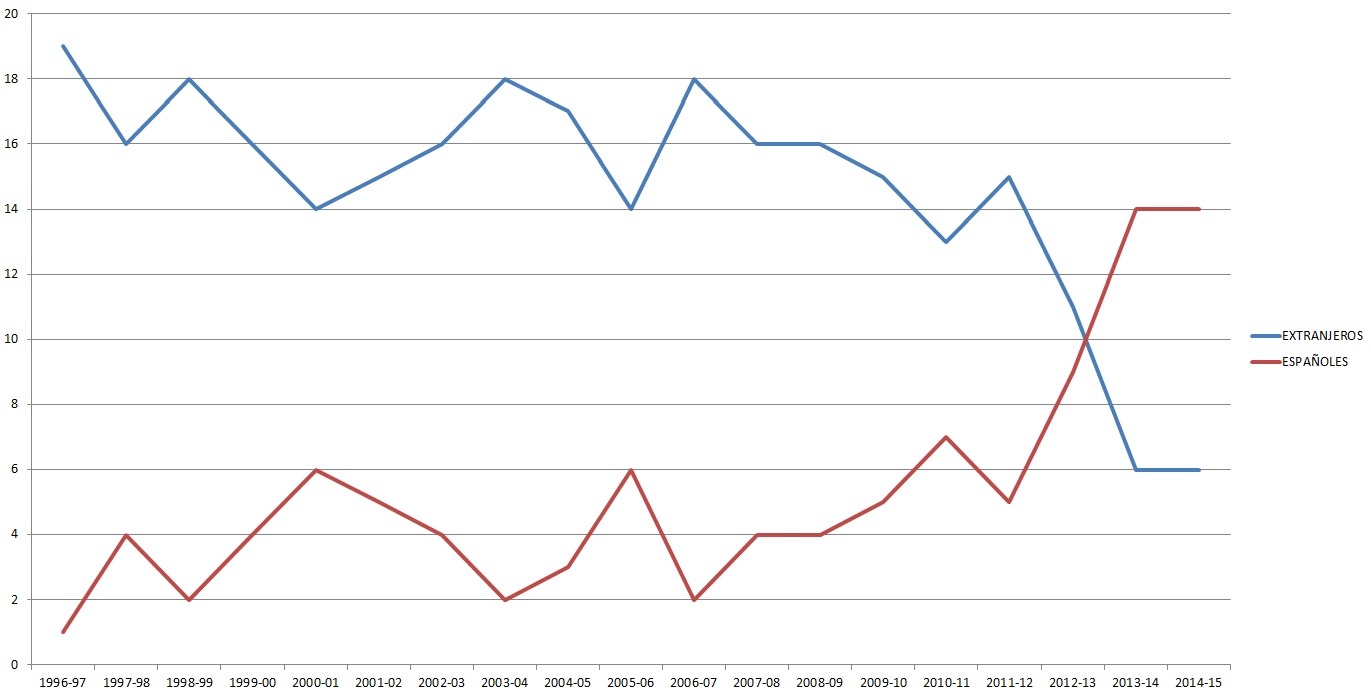 La siguiente pregunta que nos hicimos fue: ¿Estos datos son algo nuevo o vienen de años atrás?. Analizamos pues la serie histórica de la LEB/Adecco Oro. Repasamos el número de jugadores españoles entre los 20 mejores valorados al final de cada temporada desde 1996-97 y obtenemos la siguiente evolución: