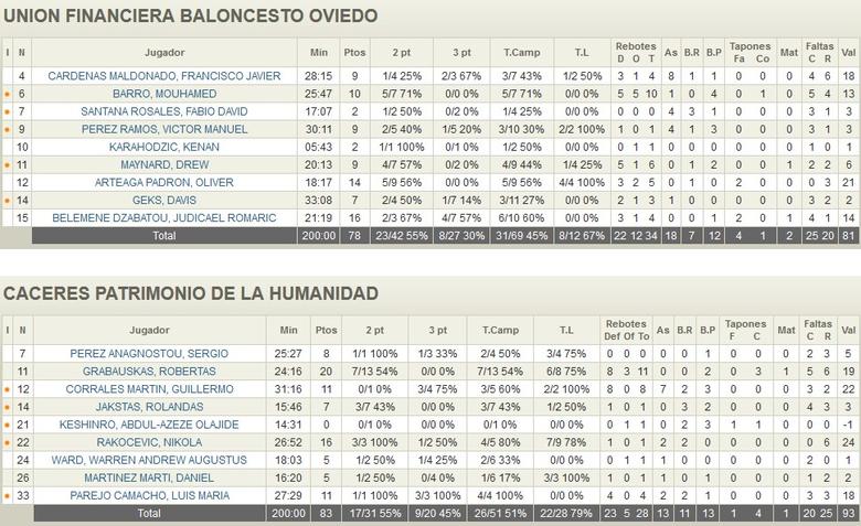 OVIEDO SE QUEDA A LAS PUERTAS DE LA REMONTADA Con 15 puntos de renta a falta de los 10 últimos minutos, el conjunto extremeño trató de ralentizar el partido desde la defensa llevando a su rival a posesiones largas. Un trabajo que dio susfrutos durante apenas unos pocos minutos ya que Unión Financiera no tardó en lanzar su ofensiva con un eficaz Oliver Arteaga y un Víctor Pérez portando el mando de las operaciones. Así llegaron a colocarse los ovetenses a rueda de su rival a falta de menos de 30” (76-79) pero, para entonces, era ya realmente tarde y al Cáceres no le tembló la mano a la hora de cerrar el que es ya su primer triunfo del curso a domicilio (78-83). El primero desde un 14 de febrero en el que ganaron por última vez a domicilio.