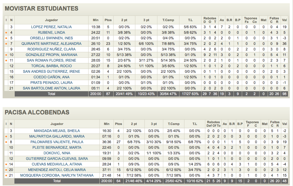 Las chicas de Adolfo González siguen en rancha, y ya suman 15 victorias seguidas, contando con el final de la temporada regular. En el día de hoy la clave estuvo en el gran partido de Alejandra Quirante que se fue hasta los 36 de valoración. El parcial del segundo y el último cuarto terminó con las ilusiones del Pacisa Alcobendas que luchó contra todo, pero no consiguió la victoria, veremos si Aitana Cuevas puede seguir jugando la fase al 100%, pues en el partido de hoy se torcio el tobillo y termino jugando algo mermada.