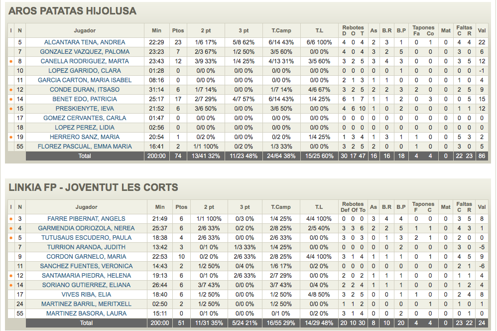 Los anfitriones se quitaron los nervios de jugar como local y con un gran primer cuarto empezaron a marcar el camino para conseguir la vicotria, donde Andrea Alcantara se fue hasta los 23 puntos y Patricia Benet añadio 17 puntos, pero la clave del éxito estuvo en el mal día desde el 6,75 de las chicas de Sergio Manzano (5/24). María Cordon con 10 puntos y 4 rebotes fue la mejor valorada.