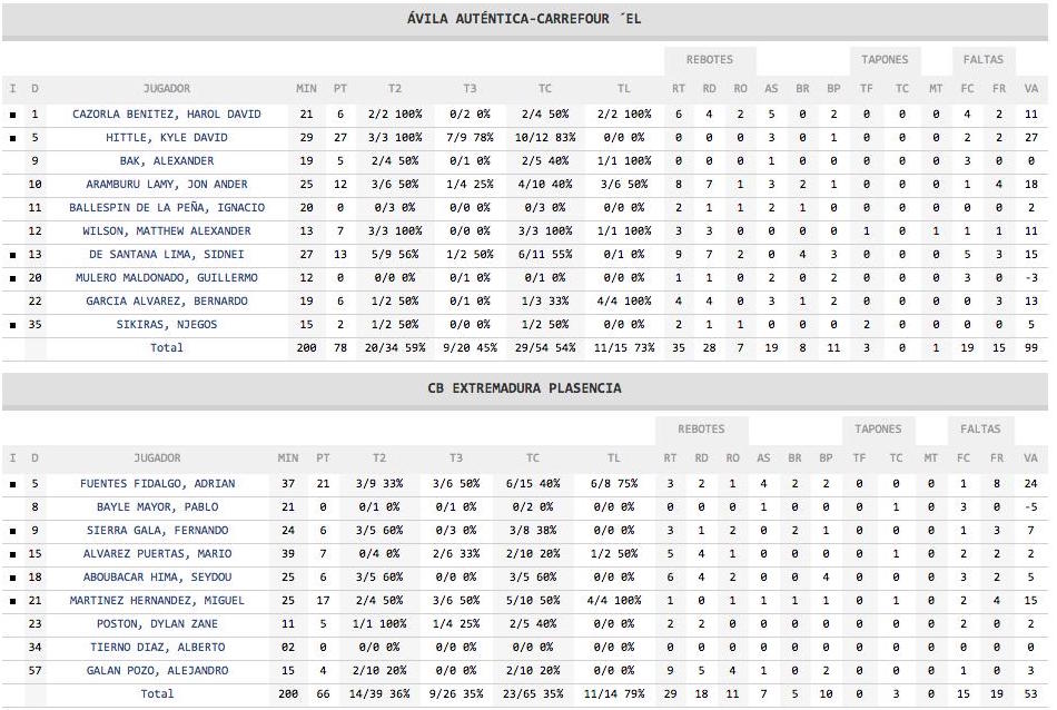Partido igualado el disputado entre los “vecinos” Ávila y Plasencia, que se resolvió gracias a la actuación estelar de un Kile Hittle que se fue hasta los 27 puntos con siete triples, cinco de ellos en los siete últimos minutos, cuando el balón más quemaba, y después de dilapidar una ventaja que había sido de 15 puntos para el equipo local en el tercer cuarto y dejar la victoria, más que necesaria para seguir en la pelea por el playoff, para los abulenses.