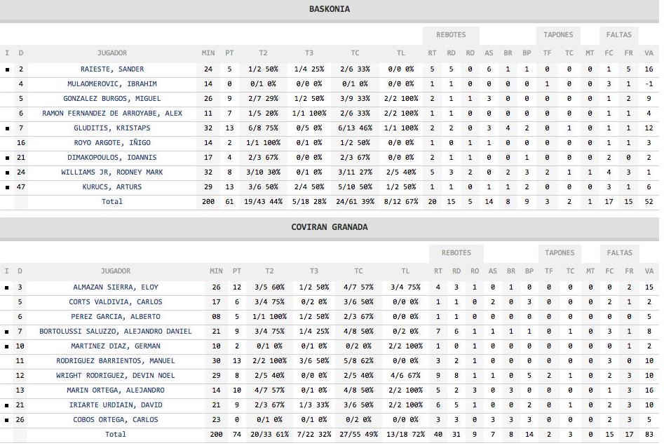 Gluditis, con 13 puntos, los mismos que Kurucs, aliados con Miguel González ofrecieron una gran imagen en los tres primeros cuartos, pero fue en el último donde Granada, apoyados en Eloy Almazán, Marín y Bortolussi consiguieron la ventaja definitiva que les otorgaba el primer puesto final.