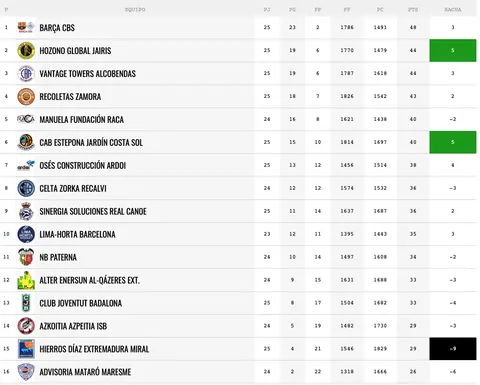 23 victorias y tan solo dos derrotas para el club del Barça, la primera llegaría en la jornada 4 ante Alcobendas y más adelante ante Manuela Fundación Raca. Pero el resto el conjunto catalán lo cuenta por victorias con una enorme Ainoha López que anotaba hasta el momento de su baja 12 puntos y era un de las grandes líderes en el vestuario. Además, se le puede considerar el faro del proyecto, ya que en su momento daría un paso atrás y bajaría de LF Endesa a LF2 para ser la capitana del club azulgrana. La jugadora ahora se encuentra en otro partido, aún más importante, que no es otro que ganar al linfoma de hodgkin que le diagnosticaron hce unas semanas. Eso sí, sigue estando presente y dando todos los ánimos posibles a su equipo.