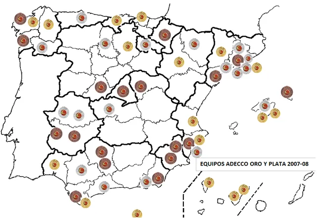 Hace unos años, publicaba en esta web un artículo llamado ‘El mapa del basket en España’ donde analizábamos la evolución de los equipos que competían en 2007-08 con la situación en 2013-14. Los resultados fueron llamativos. (también hubo versión sobre el basket femenino). En el siguiente mapa se pueden ver las provincias con equipos en LEB Oro, Plata o Bronce en 2007-08. 54 equipos arrancaron aquel año en las ligas LEB. Apenas seis años después la cifra descendió exactamente a la mitad (14 equipos en Oro y 13 en Plata en 2013-14).