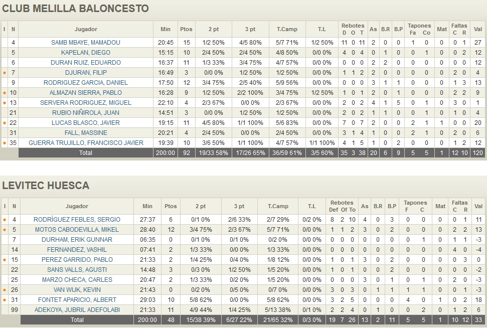 RIDÍCULO. El papel del Levitec Huesca se redujo a la mínima expresión. No anotaron ni un tiro libre de los tres que intentaron, se les acabaron muchas posesiones, ningún jugador aportaba nada destacable… La intensidad defensiva de los oscenses fue inexistente como se demuestra en las 10 faltas realizadas. Por muchos intentos de Arenas por revertir la situación, simplemente no era el día del Levitec Huesca que se fueron del partido muy temprano ante sus errores y los aciertos del Melilla Baloncesto. 32% de acierto en el tiro, hasta cinco valoraciones negativas fueron otros de los deméritos del equipo aragonés.