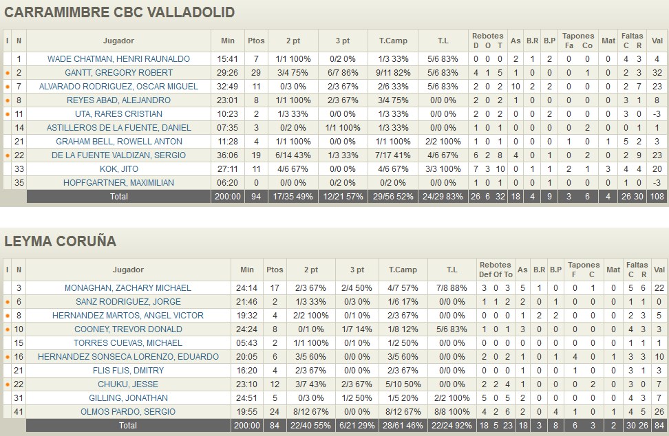 MVP GREG GANTT Partido reivindicando un puesto en el quinteto titular del escolta americano del CBCV Gregory Gantt. Con estos 29 Pts, 5 Reb, y 33 Val. conseguidos hoy, demuestra ser un jugador que debe aportar mucho al equipo vallisoletano. Se nos antoja imprescindible su aportación no solo para certificar la salvación, también para optar a un premio mayor en forma de PlayOff. Sergio olmos, con 24 Pts. 6 Reb. 26 de Val. se ha encargado de firmar la valoración más alta de su equipo hoy.