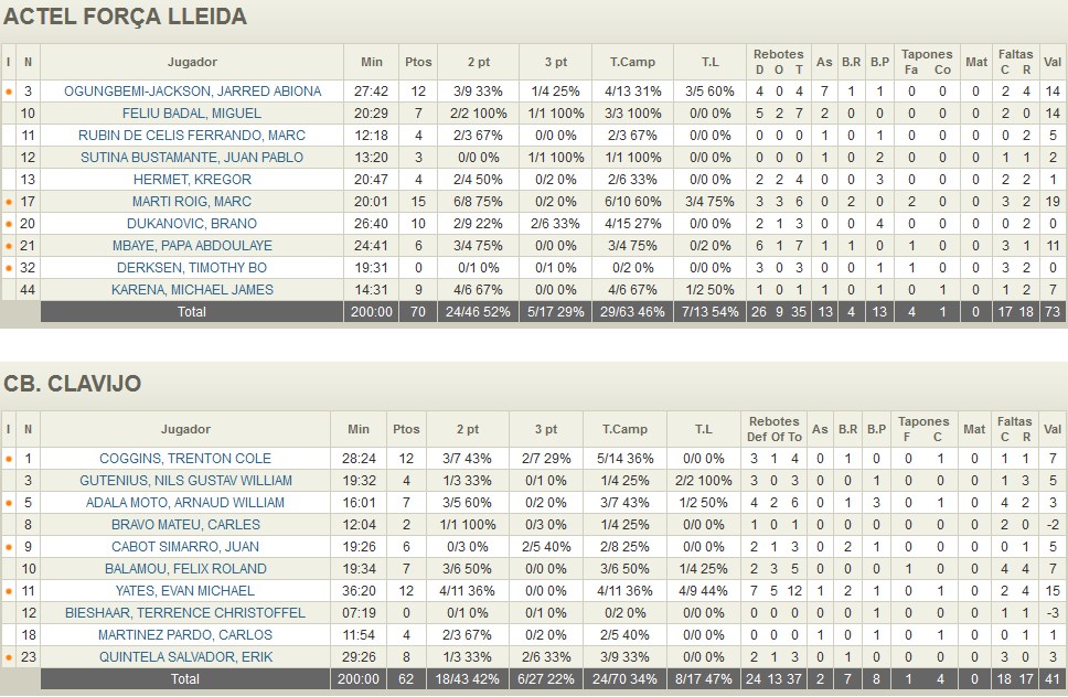 En un partido sumamente importante para sus intereses, el CB Clavijo no pudo sumar en positivo ante un Actel Força Lleida que sacó petróleo de un nuevo encuentro ante el amparo de su público. Y es que los hombres de Borja Comenge aprovecharon el respaldo de su afición para poder tomar la delantera en el tramo inicial de un choque en el que Marc Martí ejerció como martillo pilón en la pintura (16-16) antes de que su equipo pudiera marcar territorio antes del descanso (41-35). El impulso del segundo cuarto se mantuvo en la reanudación a través de una buena dirección de partido lo que se tradujo en un ligero aumento de las diferencias con el que afrontar el último cuarto con una ligera tranquilidad (62-48). Así, y pese a la reacción riojana liderada por Yates y Coggins, los de Jenaro Díaz no pudieron optar ya a un triunfo que hubiera sido sumamente importante de cara a su lucha por la permanencia (70-62).