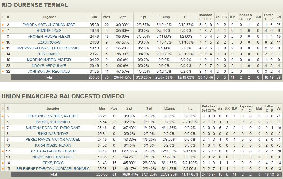 Segunda derrota consecutiva para un Unión Financiera Oviedo que topó con el buen momento de forma de un Rio Ourense Termal que parece haber puesto la directa sobre los puestos de peligro con su sexto triunfo durante los últimos siete encuentros. Un choque en el que los hombres de Gonzalo García de Vitoria brillaron de nuevo desde la defensa para hacerse muy pronto con el mando del partido (20-16). Con el marcador respaldando su trabajo, los gallegos intimidaron desde el perímetro a un rival que chocaba na y otra vez con su planteamiento defensivo para alcanzar el descanso con el encuentro complicándose por momentos (38-29). Reaccionó ligeramente el Unión FInanciera Oviedo tras el paso por vestuarios a través de la solidez interior de Oliver Arteaga (51-45) pero, para entonces, los locales parecían tener ya el choque perfectamente controlado. Los minutos pasaban y los ourensanos terminaron de certificar un triunfo con el que dar un nuevo paso al frente en su lucha por la permanencia (70-61).