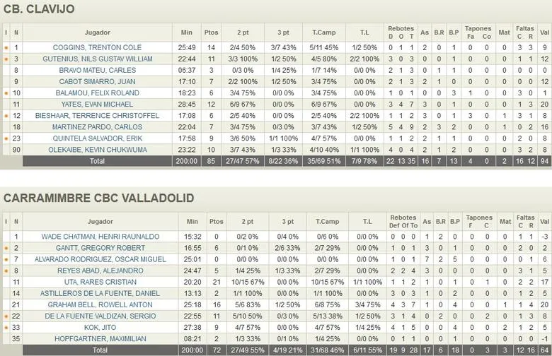 DOMINIO DEL REBOTE En el dominio en ambas pinturas estuvo una de las claves del encuentro, 35 Rbts locales por los 28 visitantes. En esta faceta, Carlos Martinez, con 9 en total, ejerció de auténtico dictador. La pareja formada por 30 Coggins y Gutenius funcionó a la perfección funciona a la perfección, convirtiéndose en un auténtico quebradero de cabeza para la defensa vallisoletana. En las filas del CBC Valladolid, sorprenden los 21 puntos anotados por el joven Cristian Uta, que con sus 10 /15 en tiros de 2 deja claro que va a ser uno de los jugadores muy a tener en cuenta esta temporada
