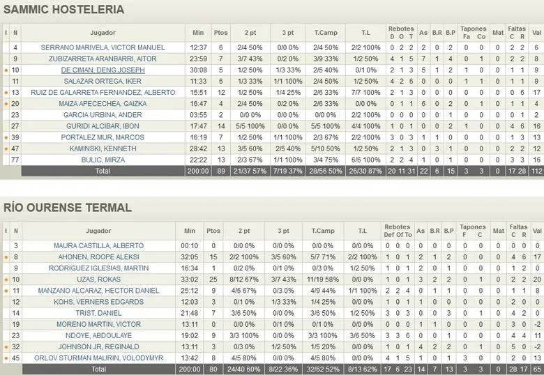 LOS TIROS LIBRES DECIDEN La cuarta personal de Trist, seguido de dos buenas canastas de Guridi y Maiza, dieron muy pronto la iniciativa a Sammic Hostelería (69-63), y en cuanto Ourense subió la agresividad defensiva, nuevamente las faltas comenzaron a sumarse en el casillero de los jugadores ourensanos, llevando a Galarreta, Bulic o Portález al tiro libre y haciendo imposible el acercamiento. Estando cinco abajo (73-68, min. 34), un triple de Bulic y un tiro largo de Portález pusieron el +10 para Sammic, y desde esas, Ourense apenas consiguió acercarse. El intento de zona 2-3 terminó con Reggie Johnson cometiendo su quinta falta, y al final Gonzalo, ante la imposibilidad de defender agresivo, optó por una zona presionante a todo campo. En esas, Sammic Hostelería controló el balón y temporizó el juego, logrando rebotes de ataque y seguir sumando en el tiro libre. Con 84-77 en el marcador, Ourense defendió bien, pero Galarreta se hizo con el rebote de ataque y sentenció con un dos más uno. Quedaba minuto y medio, y lo restante sirvió tan solo para pelear el average, una diferencia que Uzas acortaba con un triple lejano sobre la bocina.