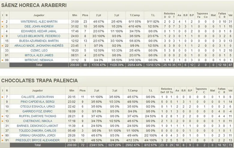 Sáenz Horeca Araberri suma una nueva victoria ante su afición. Dos de dos como local. El equipo dirigido por Antonio Pérez consiguió sumar un triunfo más en su casillero tras imponerse ante Chocolates Trapa Palencia (80-72). Un choque en el que no pudo participar Dani Lorenzo por el esguince de tobillo que sufrió en la sesión preparatoria del lunes por la mañana. Destacar la actuación de Wintering con 31 de valoración, 23 puntos y 4 asistencias.