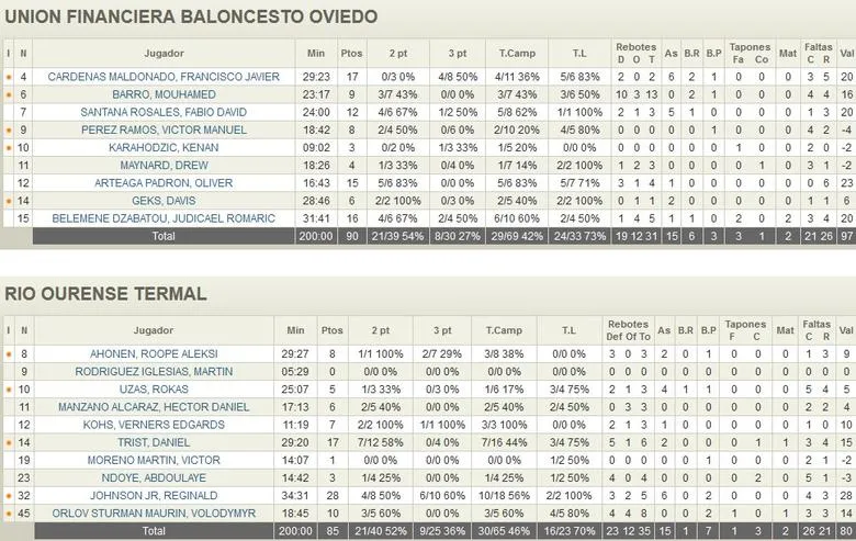 “PIERNAS” y “MUELLES” PARA LA REMONTADA. Apostó Carles Marco en el último cuarto por juntar en la pista a 4 de los mejores defensores de la liga en el uno contra uno, cada uno en su posición. Con Mou Barro en el 5, Belemene al 4 (aprovechando la inacción en esta posición de Maynard y Karahodzic), Geks en el 2 y Cárdenas en el 1, el Oviedo le puso la intensidad y energía necesaria para poder defender, provocando robos de balón (3 recuperaciones), bajar porcentajes a base de provocar tiros complicados (1/8 en triples, cuando llevaban un 8/17 hasta ese momento) y un desgaste físico que hizo q hasta el incansable Johnson no pudiera mantener el ritmo y terminara abdicando ante el mejor runch final de Cárdenas. En el apartado reboteador también se vio reflejado esa hambre con la obtención de hasta 7 rebotes ofensivos en é último cuarto, los mismos que había cogido el equipo en los 3 periodos anteriores.