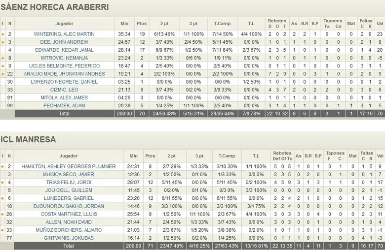 SÁENZ HORECA Araberri se le escapa la victoria sobre la bocina ante Manresa 70-71 tras una primera parte en la que el equipo dirigido por Antonio Pérez dominó el choque con su juego, controlados en defensa y muy bien en ataque. Es en la segunda parte en la que el Manresa sube su nivel defensivo y a los araberristas les falta fluidez y hace que el equipo de Aleix recorte distancia y finalmente se lleven la victoria por la mínima. Destacar la actuación de Alec Wintering con 23 de valoración, 19 puntos, 2 rebotes y 2 asistencias. Gran ambiente en las gradas en un choque en el que al descanso se realizó la presentación de la cantera.