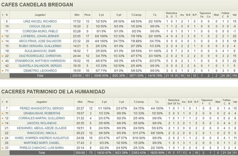 BREOGÁN TRIUNFA CON CLARIDAD Se le da bien últimamente al Cafés Candelas Breogán las visitas del Cáceres Patrimonio de la Humanidad y si el año pasado consiguió una diferencia histórica, en esta ocasión el partido se cerró con más de 100 puntos anotados y un +28 en el marcador que refleja la situación del partido.